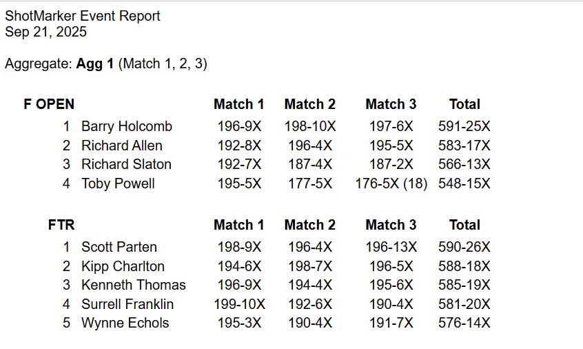 Barry Holcomb, winner of the September 2025 F-Open Division Gunny Pot for most X’s in the Division[25]