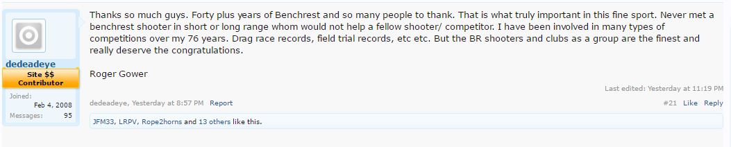 For those that have ever shot out to 1000 yards, this feat has to be amazing. This 10 shot group is being touted as a new 1000 yard scoring record. The way that I understand the scoring is that there have been lots of other 100’s, but this is the smallest group size to go with the 100. I am also posting the shooter’s comments to let everyone know that these type results rarely come quickly. Congrats Mr. Gower